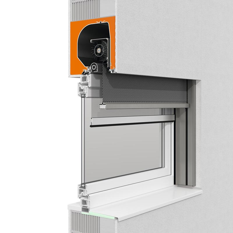 Das Textilscreens-Aufsatzsystem aus Kunststoff. Optional mit außenliegenden Putzträgern oder Aluminiumaußenblende. Die Kastenteile zum Rauminneren bestehen aus einer doppelten Hohlkammer und sorgen somit für Stabilität, Isolierfähigkeit und hohe Schallschutzwerte. Da das System komplett mit den Fenstern ausgeliefert und montiert wird, entstehen nicht nur wesentliche Vorteile in Planung und Umsetzung, sondern auch im Wärmeschutz. Durch die wärmedämmende Einheit von Fenster und Textilscreen kann wertvolle Energie gespart werden und damit bares Geld.